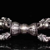 明代銀金剛杵評估,作為純手工制品,瑞麗市尚德珠寶有限公司所制作的金剛杵屬五股帶刃頭杵,每個構(gòu)件均由手工師傅制作。因此金剛杵的細節(jié)工藝均為世間之品,而金剛杵中間部位還密嵌著精細的寶石和梵文裝飾。